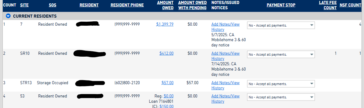 On the Login Screen you can get easy access to the “Balances Due” report. Easily switch between parks and at your finger tips you know exactly who owes what. There is even a column for amount owed with Pending. Each customer gets their own online portal, they can pay online, via ACH or CC. We are also integrated with Paylease. Supervisor can easily create Eviction notices and email them to on-site staff fpr delivery. I am very pleased with this system.